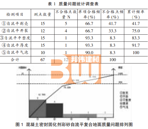 通过混凝土密封固化剂彩砂自流平复合地面质量问题排列图分析,自流平剥壳、开裂为影响整个混凝土密封固化剂彩砂自流平复合地面质量的主要问题,累计频率达到 75.0%。