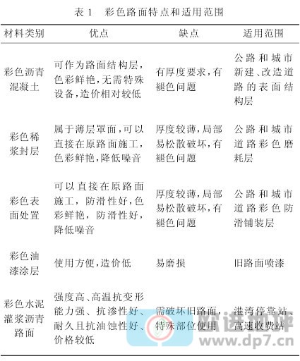 彩色路面特点和适用范围见表1。