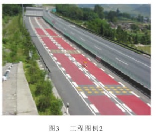 隧道的出入口:里外各延伸50m,满铺方法,在隧道入口处,增加两组间隔线收费站的减速带:采用三根1m宽,间隔5m为一组,每组间隔11m的三组间隔线,见图3。