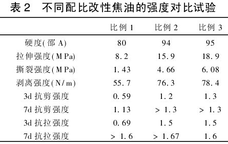 (1)改性焦油(比例1)与其它沥青材料抗拉、抗剪强度对比,结果见表1。