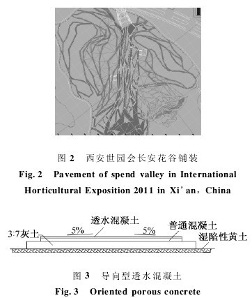 西安世界园艺博览会(简称世园会)露骨料透水混凝土铺装范围是长安花谷内广场及A,B,C,D区山坡道路。铺装景观如图2所示。