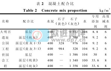 西安大明宫国家遗址公园(简称大明宫遗址公园)是一项国家重大文化项目,公园南北约2.4km,东西约1.5km。公园内部广场及一、二级园路均采用露骨料透水混凝土。其中,公园广场地面石子颜色为纯黄色,二级园路地面石子颜色为黄灰3∶1,一级园路两侧地面石子颜色为黄灰1∶3,中间地面石子颜色为纯灰色,如图1所示。