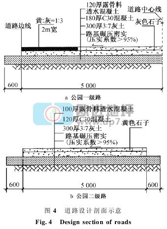 大明宫遗址公园工程中结构层碎石粒径为10~20cm,面层石子粒径为5~10cm。二级园路为6cm结构层+4cm面层,一级园路为8cm结构层+4cm面层。道路设计剖面如图4所示。世园会工程中结构层碎石粒径为8~10cm,面层石子粒径为3~6cm。透水层除需满足承载力要求外,还需满足变形性能、耐久性和表面装饰性要求。