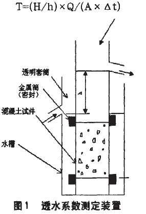 本研究的透水性能测试采用日本最近提出的《(固定水位透水测定法》来确定透水系数。其装置如图l所示。该装置采用高度为H(mm),断面积为A(mm2)的圆柱形试件,上部密封连接透明的圆柱形套筒,并在套筒的上部设一流出口。将其放入一个水槽中,水槽的上部设出水口。水槽出水口至套筒出水口之间的距离为水位差h。试验前将试件充分饱水,将水槽中充满水,直至水从出水口流出;从套筒上部不断给水,使试件上部水位高度保持不变,测定从水槽出水口流出的水量Q(mm3)和出水时间At(s),则透水系数T按下式计算;