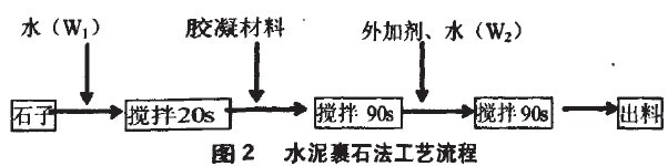 透水性混凝土拌和物中水泥浆稠度较大,且数量较少,为了保证水泥浆能够均匀的包裹在集料上,宜采用强制式搅拌机,搅拌时间为2min~4min。其投料次序采用水泥裹石法,其工艺流程如图2所示。采用这种方法,预拌水量(w.)为总用水量的8%~10%。这项技术要注意控制W.,W,太少石子预湿不完全,下一步加水泥拌和时,形成不了包裹石子表面的水泥浆壳,W.太多则形成的浆壳很稀,易被第二次加水搅拌时冲刷破坏,所以要控制好W,和两次搅拌时间。