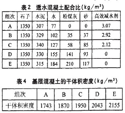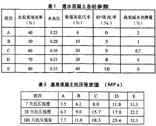 影响透水混凝土的技术性能的因素有透水方式、材料密度、原材料性能、配合比、成型方法和养护条件等:而对于透水混凝土来说,强度和透水性是对立的,在配合比设计时必须综合考虑。表l列出了透水混凝土配合比设计中的各组参数。