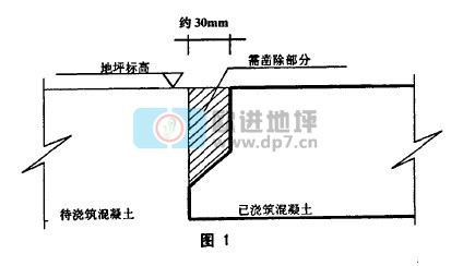 针对上述现象可采用预先控制裂缝发展方向的方法予以解决,即在距已拆模的板块边缘3cm左右用切割机预先切出一条直缝,同时将该部分混凝土凿除。这样,在紧邻板块混凝土浇筑后,收缩裂缝将沿已切割的方向裂开,见图