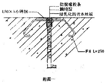 3)变形缝的形式:变形缝边缘四周均设置 50 X 5不绣钢角铁,不绣钢角铁安装标高要准确、表面要平整,缝隙通顺,宽窄~致(如下图一所示)。