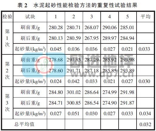 将P·C32.5 水泥, 按上述的起砂性能检验方法,反复试验3 次,每次试验5 个试块,验证上述检验方法的可靠性和检验结果的重复性。水泥起砂性能检验方法的重复性试验结果见表2。由表2 可见,3 次检验结果的平均值误差不大,重复性较好。