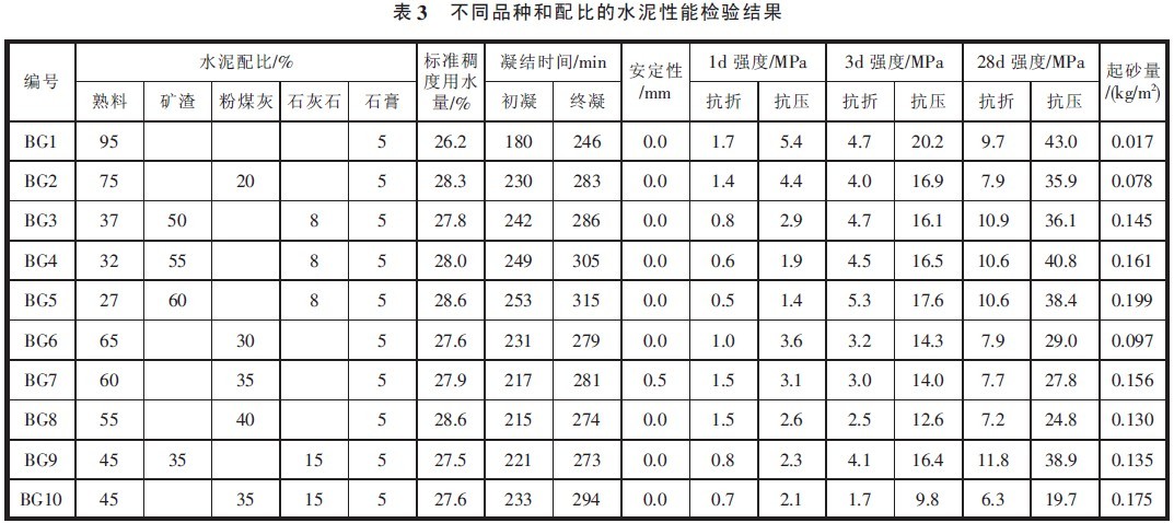 利用1.1 节的试验材料配制了一系列不同品种和配比的水泥,其物理性能检验结果见表3。按1.2 节试验方法进行检验,检验结果见表3,可见硅酸盐水泥(BG1)和普通水泥(BG2)的起砂量较小。