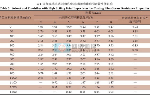 对于乳化剂和高沸点溶剂的添加量,在一定范围内,添加越多对耐油污性能的提高越明显,在实际应用中,可根据涂料的黏度、贮存稳定性以及底材油污含量情况来确定。