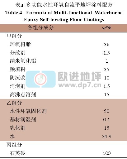 通过大量的试验研究,研制出了多功能水性环氧自流平地坪涂料,其配方见表4。