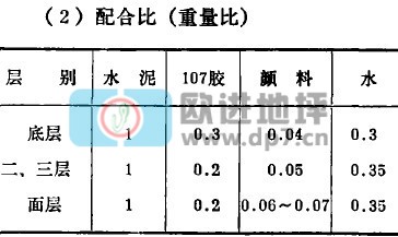 第一,先将一半水和颜料搅匀,一半水和107胶搅匀,然后将两种混合物倒入水泥中,拌匀即可,随拌随用,拌合物一小时内用完。第二,基层洗刷干净,施工前保持湿润,但不要有积水,施工分四层进行,每层一奄米厚,第一层(底层)即将底料用铁板沿基面用力刮压,要求填平嵌实;待底层收干后(即不被脚踏陷为准),即做第二层,第二层收干后做第三层,最后第四层,力求平整光滑。一般在2。。c气温时,一天可做完四层。待最后一层收干12小时后,开始洒水养护3戈5天。要求标准高的房间,可定期打地板腊,光滑、发亮。