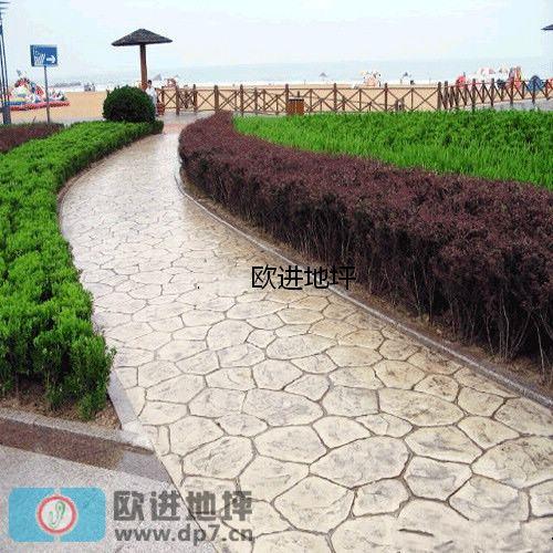 浇筑压膜混凝土施工——压膜混凝土施工初凝时撒布彩色渗透强化干粉(压膜粉),并使之抹平——撒布彩色脱模粉——模具压花——除去脱模粉——养护——封闭剂(界面剂)——密封?;?/p>