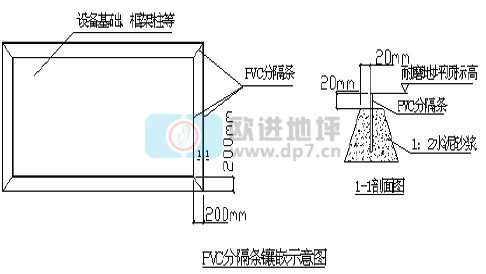 (4) 标高测设及镶嵌分隔条。用水准仪将+50cm标高所有框架柱及墙面上,并据此贴出灰饼,灰饼间距不大于3m,灰饼材料建议选用细石混凝土。根据测设的标高在所有设备基础、混凝土柱、沟道、坑池、洞口、管道与耐磨地坪交接处镶嵌PVC分隔条。分隔条镶嵌必须牢固、平直、顺滑,上标高准确。镶嵌完成后必须用施工线或者水准仪符合校验,本道工序是控制好耐磨地坪平整度的前提,标高必须由专业技术人员进行测量。分隔条镶嵌如下图所示: