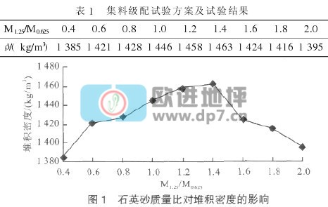 集料的级配对材料的强度、工作性、耐久性有着较大的影响,将两种粒级石英砂以不同质量比(M1.25/M0.625)进行混合,测试其堆积密度(ρ'),并选择最大堆积密度所对应的比例对两种粒级石英砂进行掺配,可使地坪硬化剂在固定胶凝材料用量的基础上尽量致密并减少干缩。试验结果见表1。如图1所示,混合后的集料堆积密度随M1.25/M0.625的变化而呈抛物线规律变化,其最大点位于M1.25/M0.625为1.4处,最大堆积密度为1 463 kg/m3。
