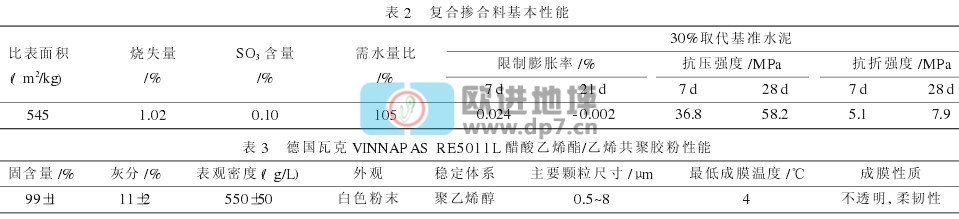 水泥砂浆中掺入超细粉煤灰和矿渣微粉,不仅可以提高砂浆的综合性能,而且有着积极的社会效益。单掺粉煤灰使砂浆的早期强度明显下降,但后期强度有较大增长,甚至超过不掺粉煤灰的砂浆。矿粉单独使用时,对早期强度影响不大,后期强度有很好的增长,但掺入矿粉后,砂浆的自收缩有可能增大,矿粉越细,自收缩越大。将粉煤灰和矿粉复合混磨,可以获得对砂浆性能的有效改善,而且粉煤灰和矿粉的二次水化作用物理填充作用可以提高砂浆的密实度,同时可弥补由于单掺聚合物胶粉所导致的强度下降[2]。天然硅灰石粉具有较好的纤维形态,有研究表明一定掺量的硅灰石粉可提高水泥胶砂试件的抗折强度[3]。另外,考虑到上述材料的添加有可能使干粉砂浆的收缩增加,为此在复合掺合料中掺入膨胀组分。将粉煤灰、矿渣粉、天然硅灰石粉及膨胀组分进行混磨,过筛,形成复合掺合料,其性能见表2。