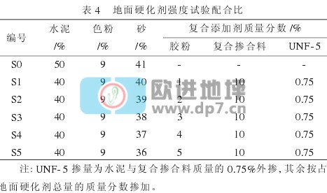 (1)硬化耐磨地坪干粉砂浆添加剂由可再分散乳胶粉、复合掺合料、UNF-5高效减水剂按合理配合比构成。推荐掺量为英砂39%,胶粉2%,复合掺合料10%,UNF-5外掺0.75%。