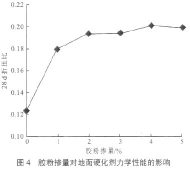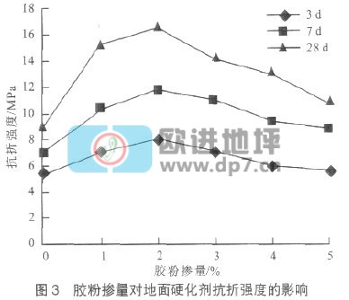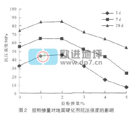 (1)如图2所示,随胶粉掺量的增加,地面硬化剂各龄期抗压强度变化趋热大致相同,抗压强度有上升阶段,随后下降。当胶粉掺量为1%、2%时,28d抗压强度可提高12.3%~14.2%,可以认为复合添加剂中的减水组分抑制了由于胶粉的高需水量对强度所形成的不利作用,同时复合掺合料中微粉效应及二次水化效应可增加材料的也对强度的增长起到了积极的作用。当胶粉掺量为3%、4%、5%时,抗压强度逐渐下降,甚至低于空白试件,此时在复合添加剂其它组分不变的情况下,胶粉的需水量造成水灰比增大,与其抑制水化的性能共同作用下,使抗压强度明显下降。