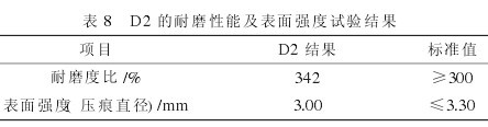 根据上述试验,以D2的配合比进行耐磨性能及表面强度试验,按JC/T 906—2002《混凝土地面用水泥基耐磨材料》中规定进行,测试结果见表8。