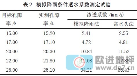 从试验结果分析,模拟降雨法与常水头法相比,测得的渗透系数均较小一些,并有随孔隙率的增加,两者差值增大的趋势。