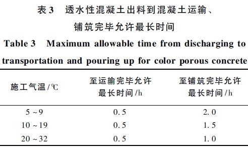 3) 透水混凝土拌合物运输时要防止振动造成离析,应注意保持拌合物的湿度,必要时采取遮盖等措施。透水混凝土拌合物从搅拌机出料后,运至施工地点进行摊铺、压实直至浇筑完毕的允许最长时间应根据混凝土初凝时间及施工气温确定,并应符合表3 的规定。